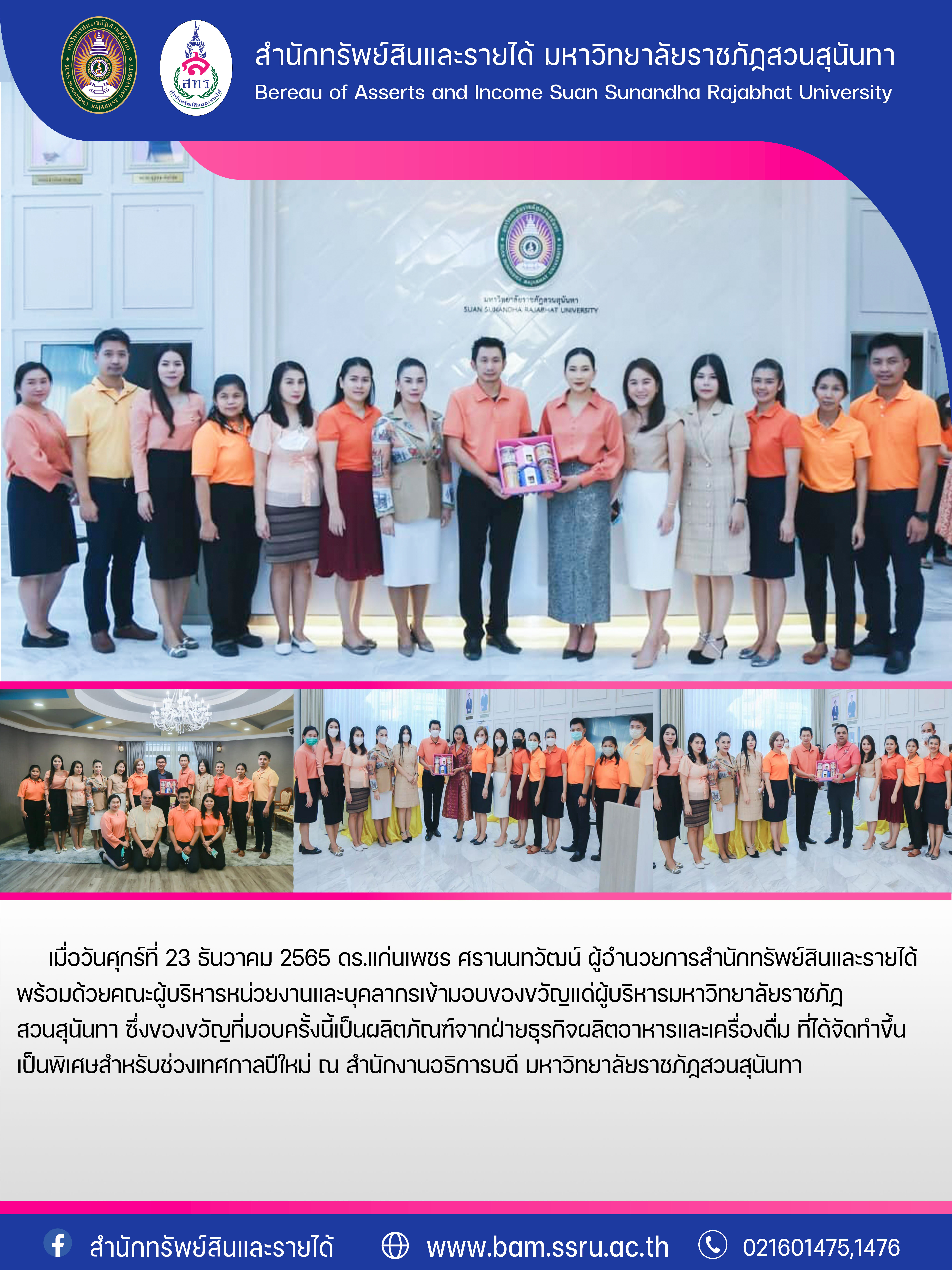 23 December 2022 - Dr. Kanpetch Saranonthawat, Director of Bureau of Asset and Income along with the administrators and staff presented New Year gifts, special products for New Year era from the Beverage and Food Production Department, to the SSRU executives.