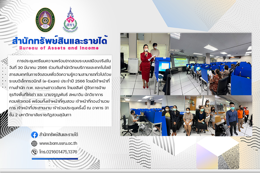 preparatory meeting (Virtual System Test) on March 30, 2023 in conjunction with the Office of Resource and Information Technology In organizing an examination to measure general knowledge with electronic systems (e-Exam) for the year 2023, with officials from the Office of the Civil Service Commission and Ms. Walikorn Komolsing, manager of the rental area business department, and Mr. Jaroonpan Sanawin, academician computer along with the examiner Administrative staff Coordinator including computer technical staff attended this meeting at Building 31, 2nd floor, Suan Sunandha Rajabhat University.