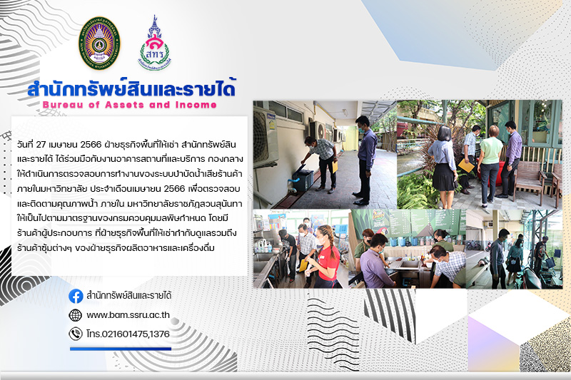 On 27 April 2023 – The Rental Space Department, Bureau of Assets and Income joined hand with Building and Landscape Department, General Affairs Division to inspect the wastewater treatment system of SSRU stores and shops for the year 2023 for monitoring the water quality in order to meet the standards set by the Pollution Control Department.