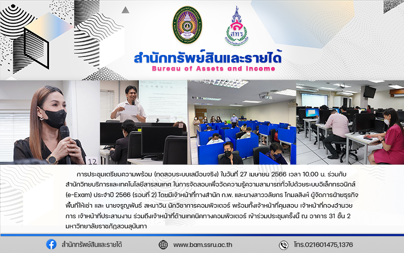 On 27 April 2023 at 10:00 hrs. – The Rental Space Department joined hand with Office of Academic Resources and Information Technology organized an examination for assessing general knowledge by electronic system (e-Exam) for the year 2023 (round 2) at Building 31, 2nd floor, Suan Sunandha Rajabhat University. The participants were officers from the Office of the Civil Service Commission, Miss Walaikorn Komolsingha (Manager of Rental Space Department), Mr. Jaroonphan Sahanawin (Computer Technical Officer), including proctor and related officers.