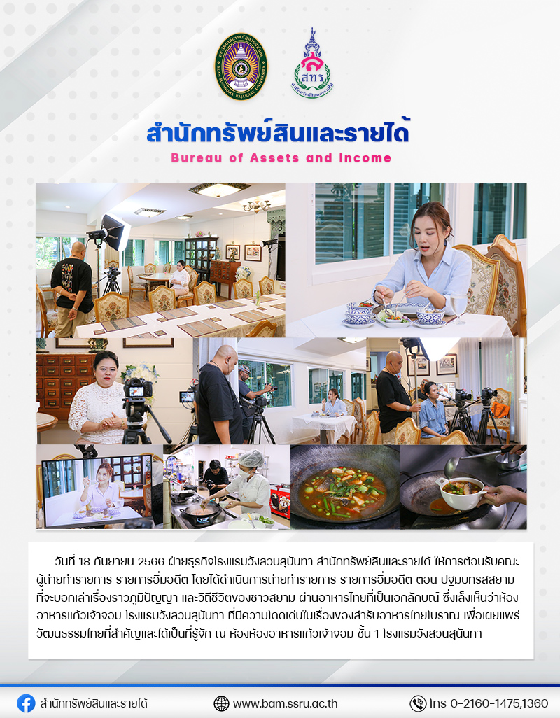 On 18 September 2023 - Suan Sunandha Palace Hotel Department, Bureau of Assets and Income welcomed the filming group of the Imm A-deet program, episodes "First Chapter of Siam Flavor" that will tell the story of the wisdom and way of life of the Siamese people through unique Thai food that is seen as Kaew Chao Chom Restaurant of Suan Sunandha Palace Hotel, where is outstanding in its traditional Thai dishes to promote important and well-known Thai culture.