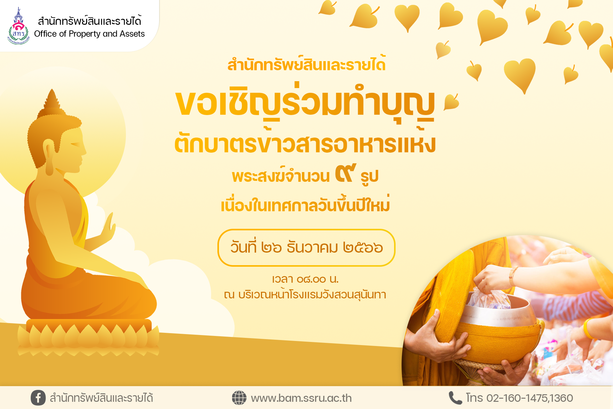 Bureau of Assets and Income invites all to make a merit by offering rice and dried food to 9 monks on the occasion of the New Year festival on 26 December 2023 at 08:00 hrs. in front of Suan Sunandha Palace Hotel.