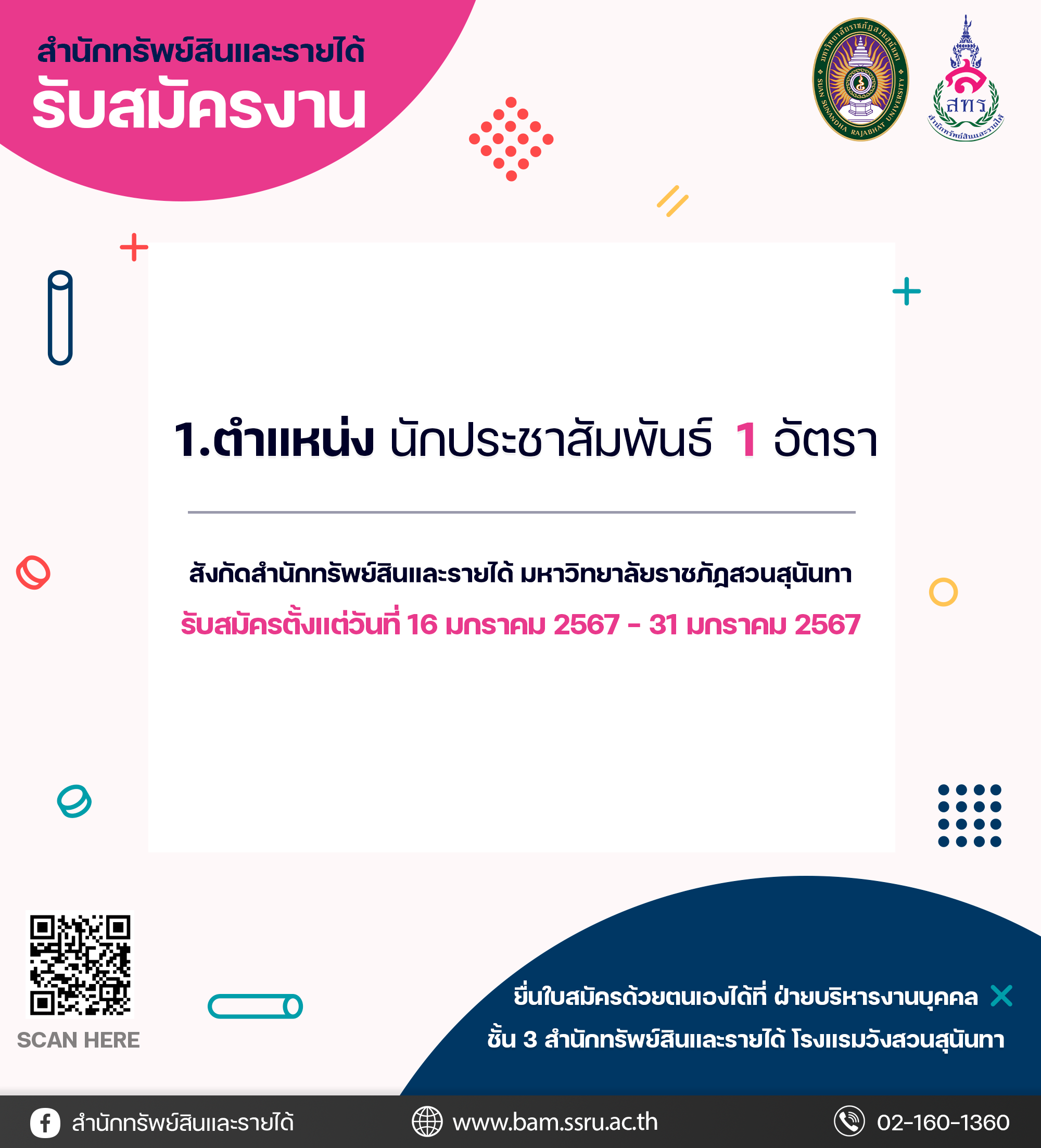 Affiliated with the Office of Property and Assets, Suan Sunandha Rajabhat University, we are now accepting applications from January 16-31, 2567.