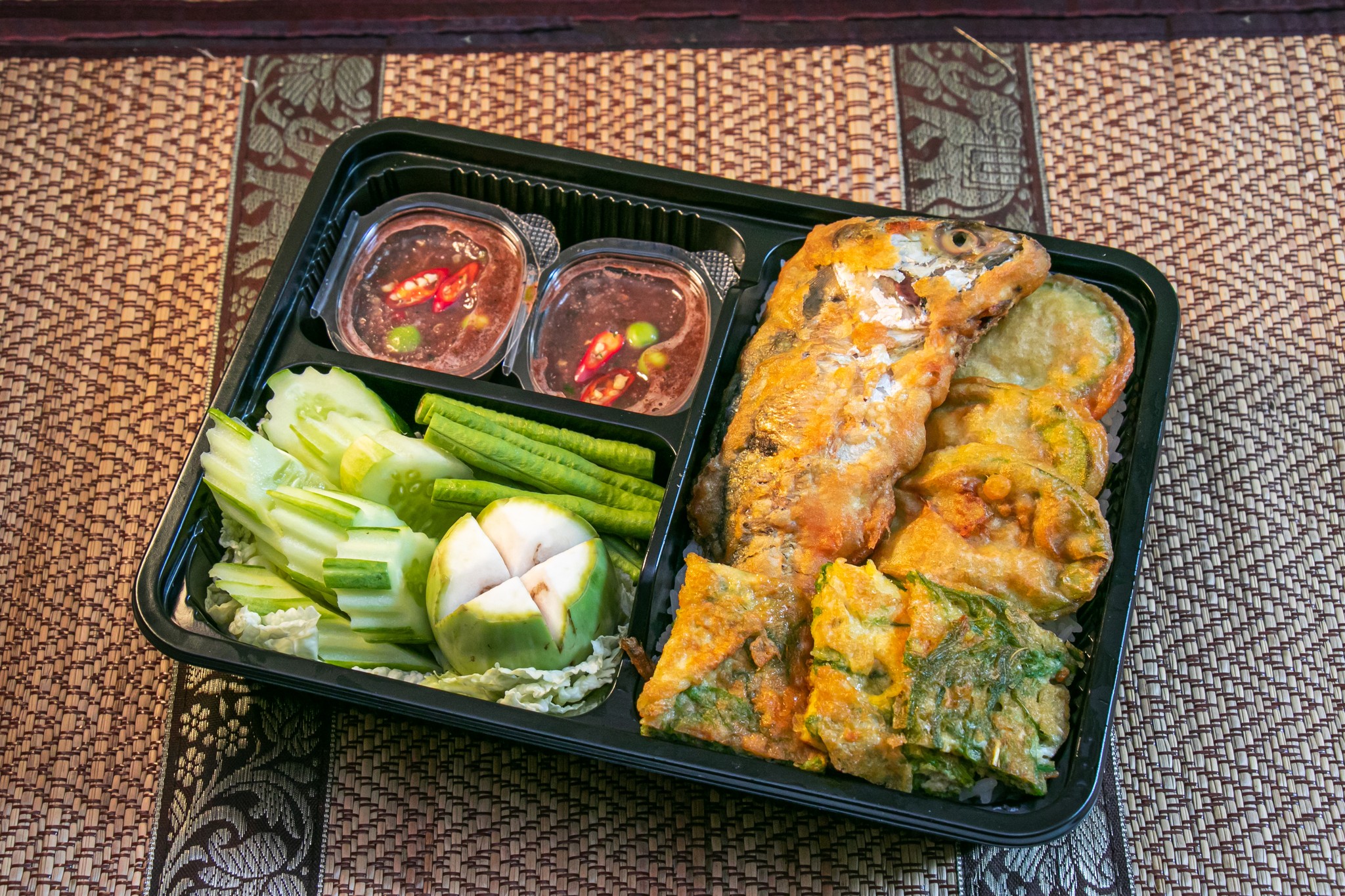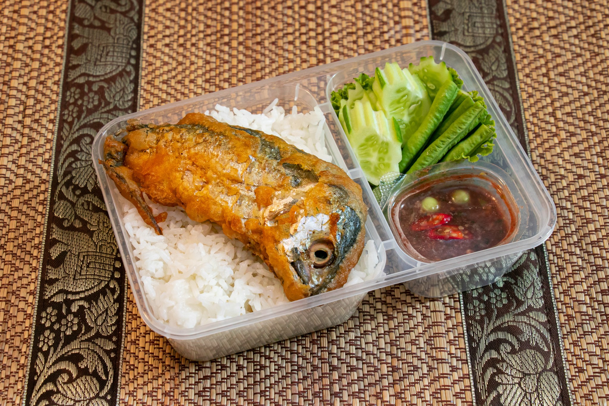 - Rice with mackerel and shrimp chili paste (small set), 60 baht per set.