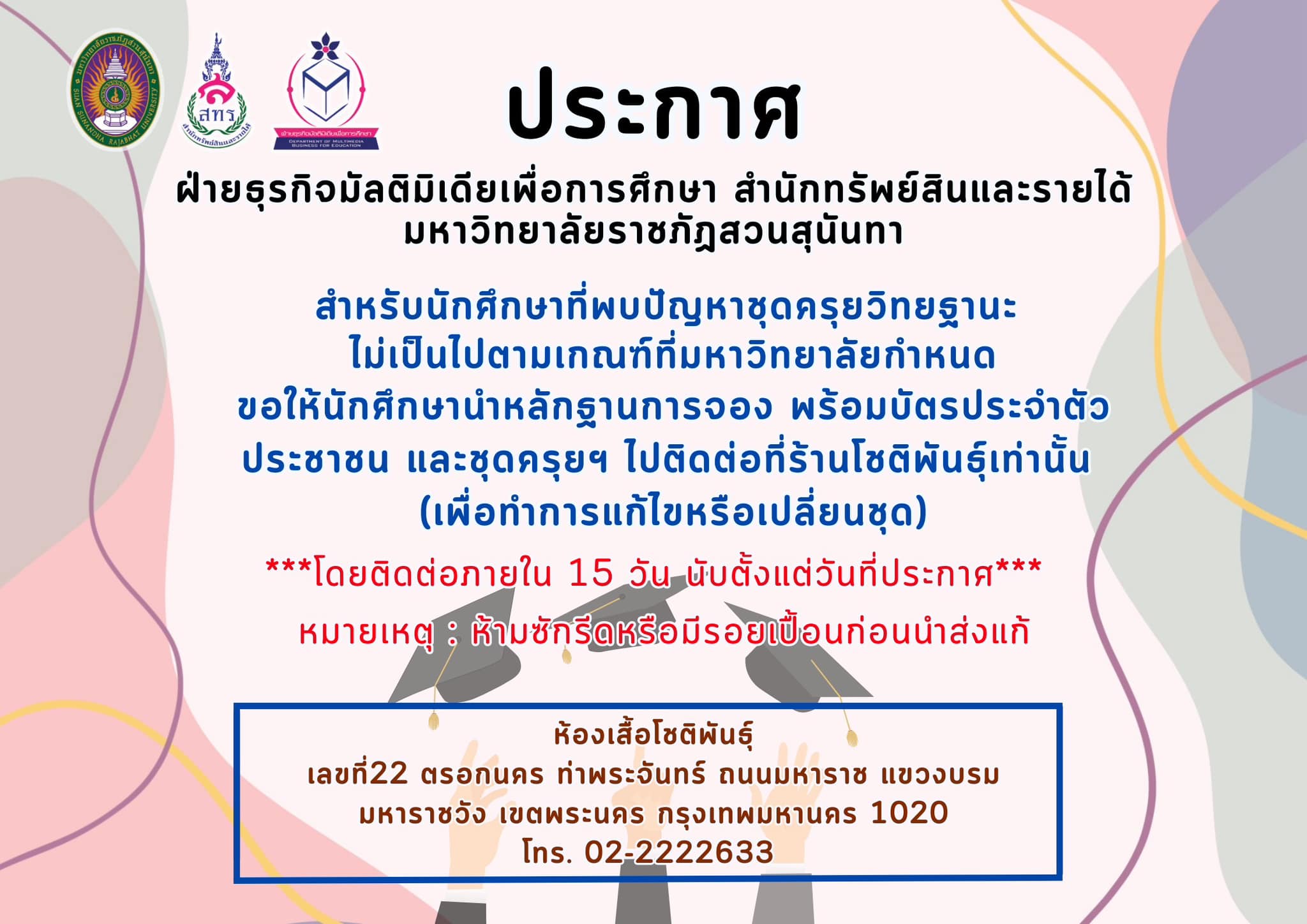 Announcement of extension for requesting to change the graduation gowns, please bring evidence of reservation, ID card and graduation gown to contact Chotiphan Shop within 15 working days from the date of announcement.