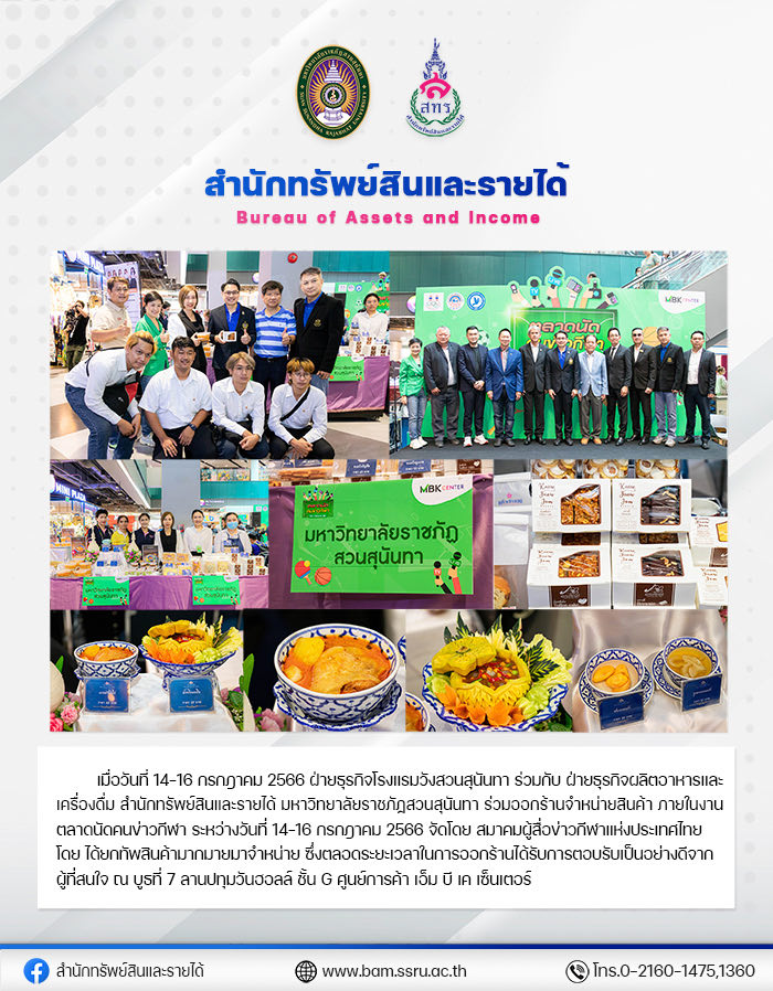 Suan Sunandha Palace Hotel Department together with the Food and Beverage Production Department, Bureau of Assets and Income, Suan Sunandha Rajabhat University set up a booth at the sports news open market between 14-16 July 2023, hosted by the Sports Reporters Association of Thailand.