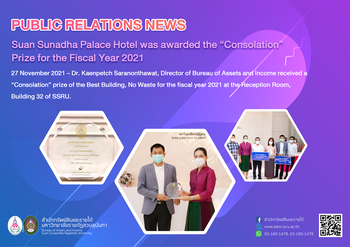27 November 2021 – Dr. Kaenpetch Saranonthawat, Director of Bureau of Assets and Income received a “Consolation” prize of the Best Building, No Waste for the fiscal year 2021 at the Reception Room, Building 32 of SSRU.