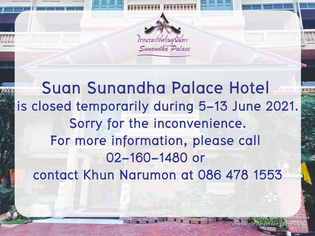 Suan Sunandha Palace Hotel is closed temporarily during 5-13 June 2021.