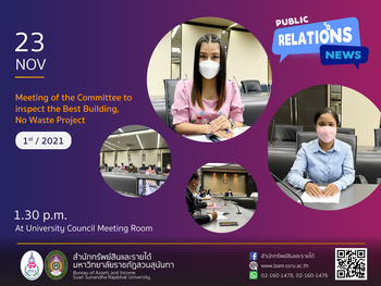 23 November 2021 – Miss Jeeranan Weamprakon, Head of the Office of Property and Income and Miss Patcharee Boontham, Administration Officer joined the 1st Meeting of the Committee to inspect the Best Building, No Waste Project at University Council Meeting Room, being presided over by Asst. Dr. Preecha Pongpeng, Vice President for Administration.