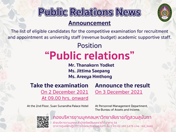 In this regard, a mentioned list above to take the examination on 2 December 2021 at 09.00 hrs. onward, at the 2nd Floor, Suan Sunandha Palace Hotel; and will announce the result on 3 December 2021 at Personnel Management Department, The Bureau of Assets and Income.