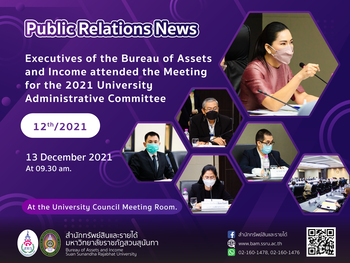 13 November 2021 – Dr. Kaenpetch Saranonthawat: Director, the Bureau of Assets and Income attended the 12th Meeting for the 2021 University Administrative Committee, being presided over by Assoc. Prof. Dr. Chutikarn Sriviboon, the President of Suan Sunandha Rajabhat University. The meeting was organized at the University Council Meeting Room.