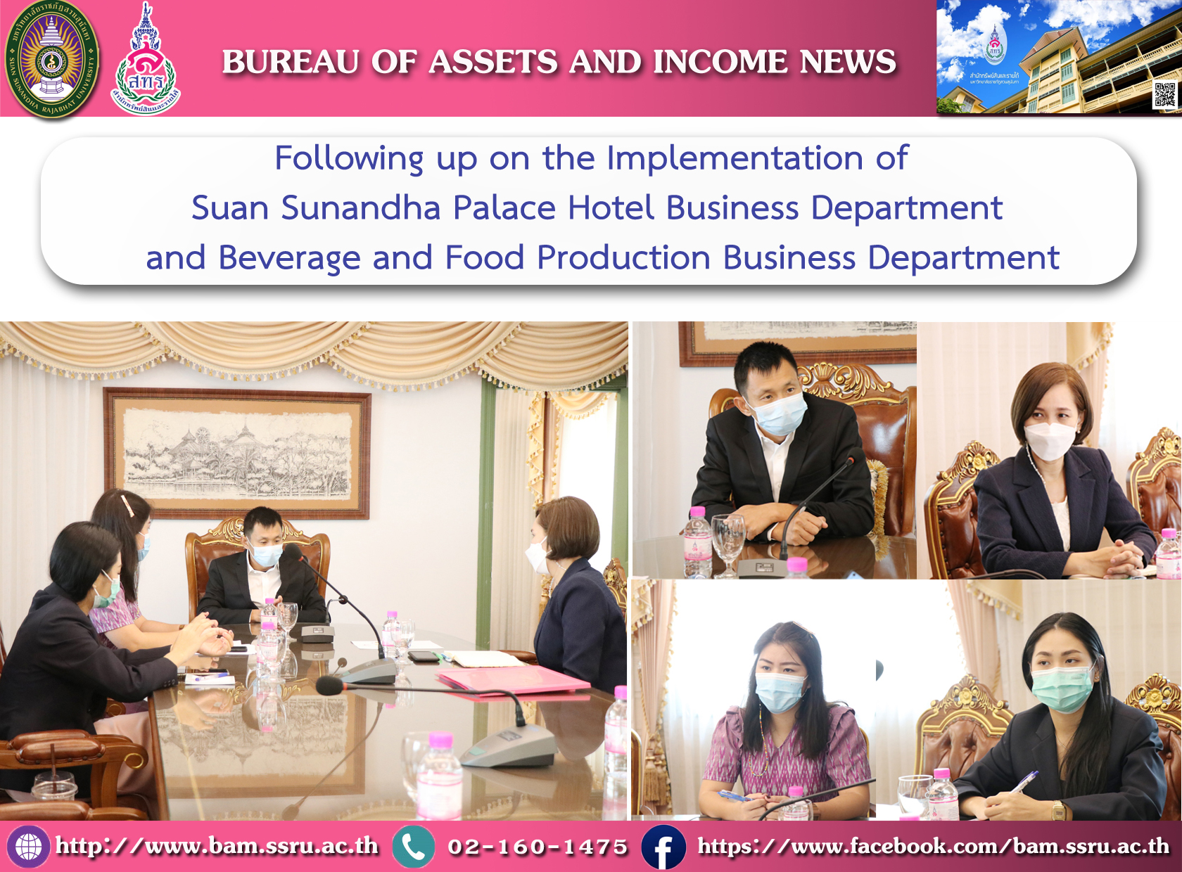 6 July 2021 – Bureau of Assets and Income organized the meeting to follow up on the implementation Suan Sunandha Palace Hotel Business Department and Beverage and Food Production Business Department at Ruen Rim Nam Meeting Room, which led by Dr. Kaenphet Sarannotawat, Director. The participants were executives and personnel.