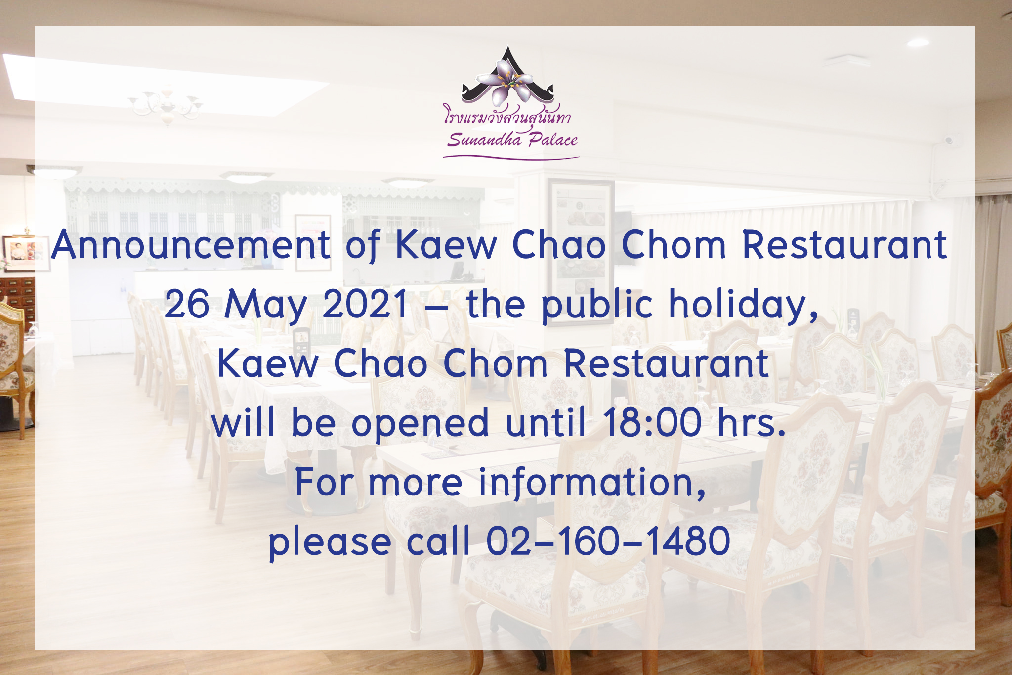 26 May 2021 – the public holiday, Kaew Chao Chom Restaurant will be opened until 18:00 hrs.