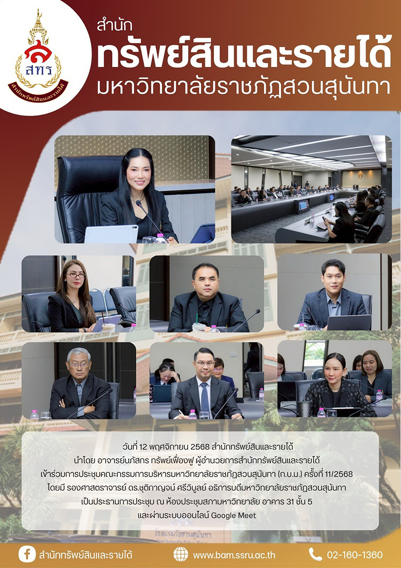 > วันที่ 12 พฤศจิกายน 2568 สำนักทรัพย์สินและรายได้ นำโดย อาจารย์นภัสกร ทรัพย์เฟื่องฟู ผู้อำนวยการสำนักทรัพย์สินและรายได้ เข้าร่วมการประชุมคณะกรรมการบริหารมหาวิทยาลัยราชภัฏสวนสุนันทา (ก.บ.ม.) ครั้งที่ 11/2568