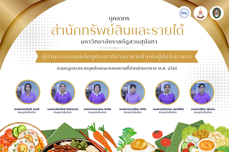 บุคลากร สำนักทรัพย์สินและรายได้ มรภ.สวนสุนันทา ผ่านการอบรมหลักสูตรสุขาภิบาลอาหารสำหรับผู้สัมผัสอาหาร ตามกฎกระทรวงฯ พ.ศ. 2561