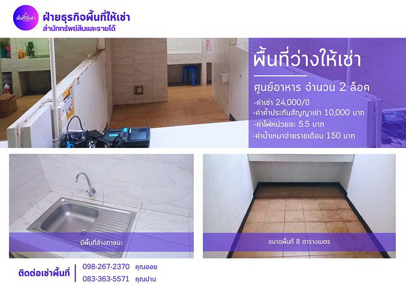 > พื้นที่ว่างให้เช่าล็อคร้านอาหาร จำนวน 2 ล็อค : ขนาดพื้นที่ 8 ตารางเมตร : พิกัด ศูนย์อาหาร มรภ.สวนสุนันทา