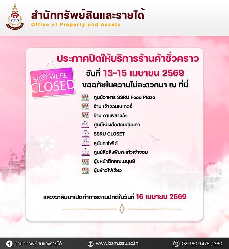 สำนักทรัพย์สินและรายได้ ประกาศปิดให้บริการร้านค้าชั่วคราวต่อไปนี้ ในวันที่ 13 - 15 เมษายน 2569