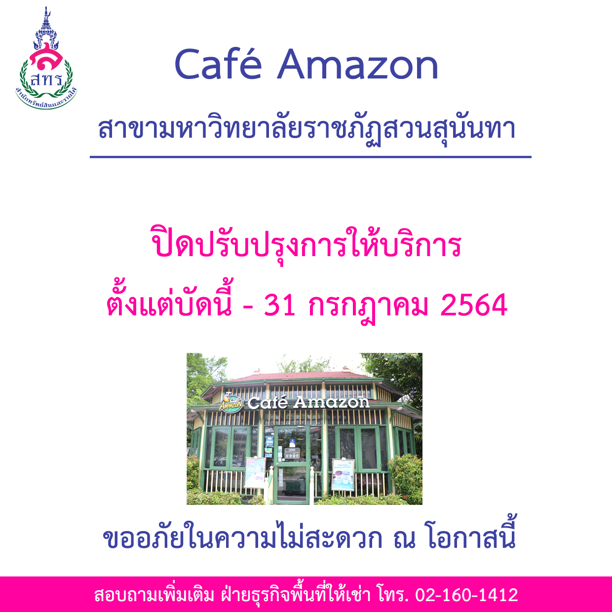 ร้าน Café Amazon สาขามหาวิทยาลัยราชภัฏสวนสุนันทาปิดปรับปรุงการให้บริการ