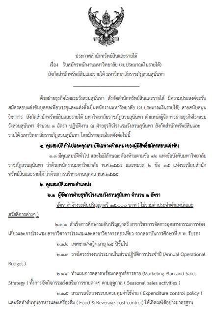 ฝ่ายธุรกิจโรงแรมวังสวนสุนันทา สำนักทรัพย์สินและรายได้ เปิดรับสมัครตำแหน่งผู้จัดการฝ่ายธุรกิจโรงแรมวังสวนสุนันทา จำนวน 1 อัตรา สนใจสมัครด้วยตนเองได้ตั้งแต่วันจันทร์ 23 พฤษภาคม 2565 – วันศุกร์ 29 กรกฎาคม 2565 ในวันเวลาราชการ เวลา 08.30 – 16.00 น. ณ ฝ่ายบุคคล ชั้น 3 โรงแรมวังสวนสุนันทา มหาวิทยาลัยราชภัฏสวนสุนันทา