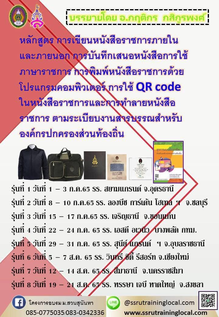 หลักสูตร การเขียนหนังสือราชการภายในและภายนอก การบันทึกเสนอหนังสือ การใช้ภาษาราชการ การพิมพ์หนังสือราชการด้วยโปรแกรมคอมพิวเตอร์ การใช้ QR code ในหนังสือราชการและการทำลายหนังสือราชการ ตามระเบียบงานสารบรรณสำหรับองค์กรปกครองส่วนท้องถิ่น