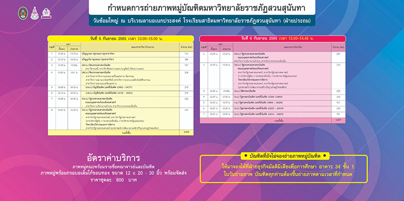แจ้งกำหนดการถ่ายภาพหมู่บัณฑิตมหาวิทยาลัยราชภัฏสวนสุนันทา ระหว่าง วันที่ 30 สิงหาคม 2565 ถึงวันที่ 6 กันยายน 2565