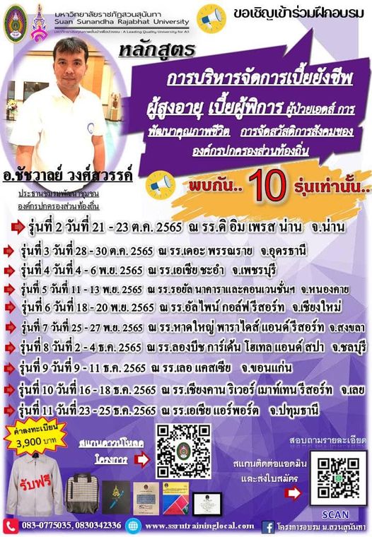 หลักสูตร การบริหารจัดการเบี้ยยังชีพผู้สูงอายุ เบี้ยผู้พิการ ผู้ป่วยเอดส์ การพัฒนาคุณภาพชีวิต การจัดสวัสดิการสังคม ขององค์กรปกครองส่วนท้องถิ่น