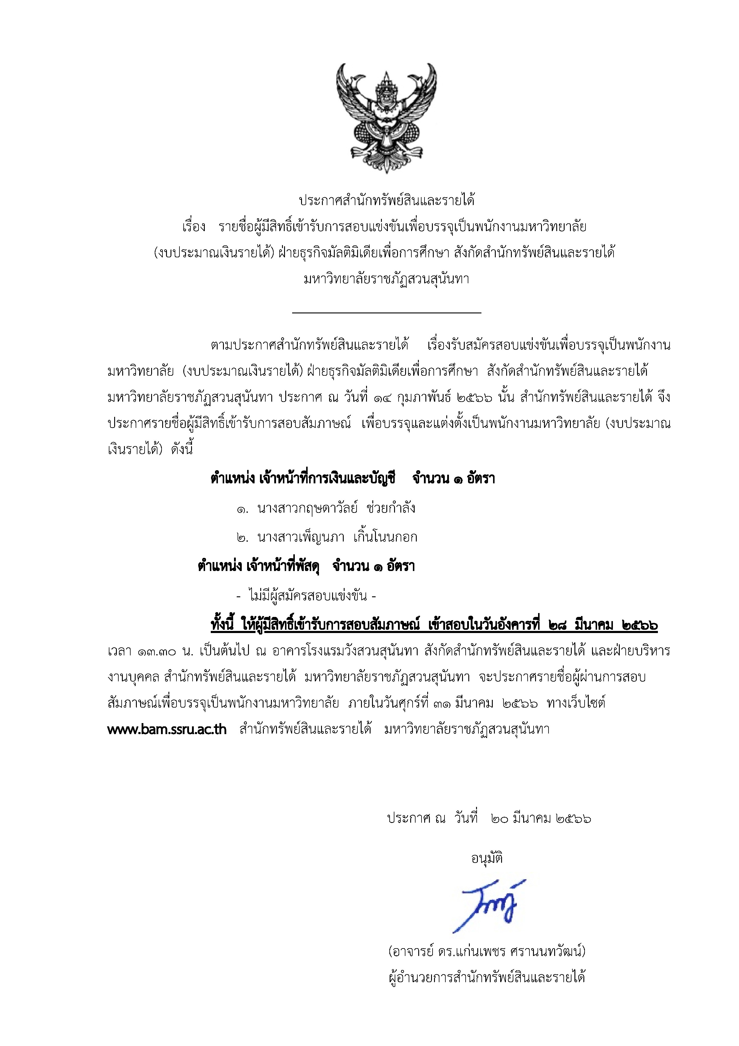 ประกาศรายชื่อผู้มีสิทธิ์เข้ารับการสอบแข่งขันพนักงานมหาวิทยาลัย