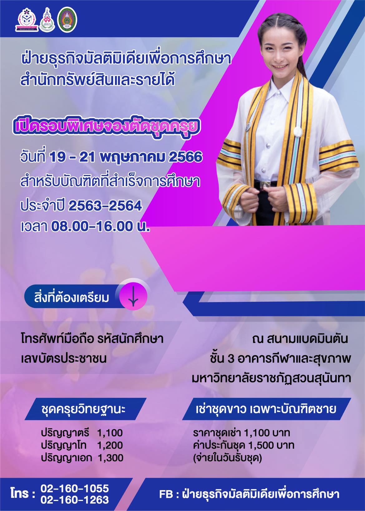 > เปิดรอบพิเศษจองตัดชุดครุยวิทยฐานะรอบสุดท้าย วันที่ 19-21 พค 2566 เวลา 09.00-16.00 น.