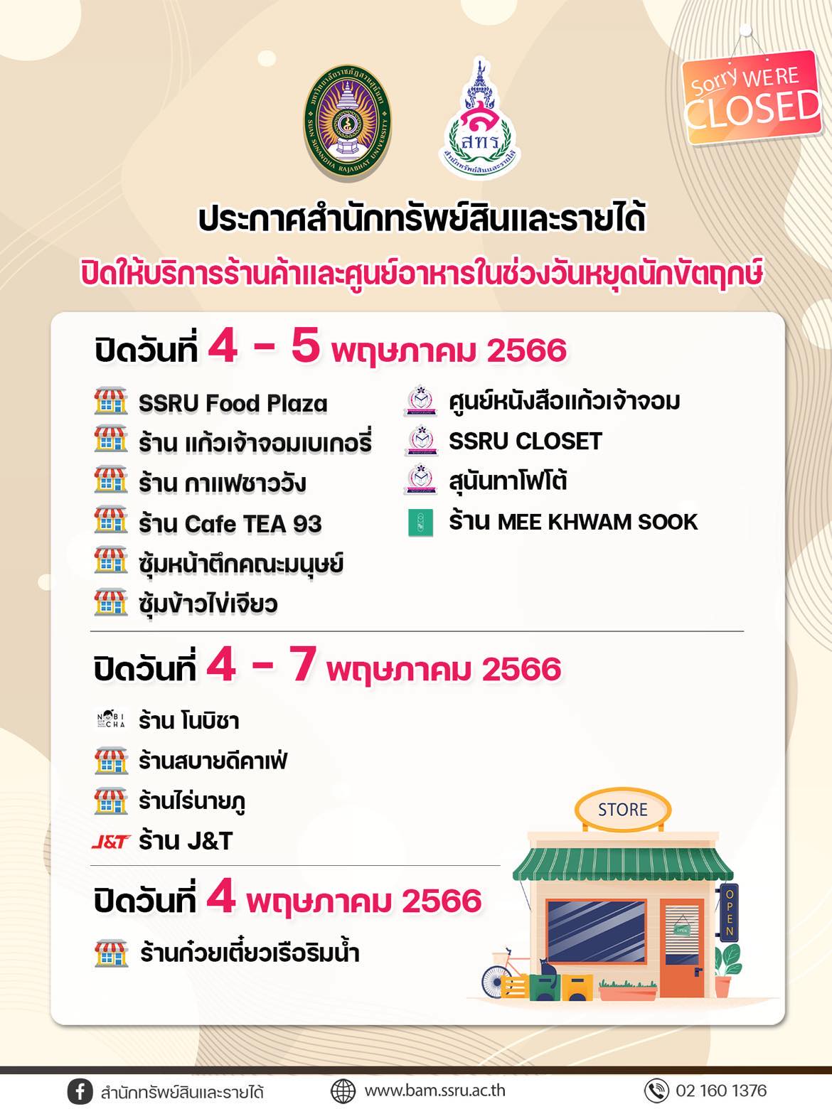 ประกาศสำนักทรัพย์สินและรายได้ ร้านค้าและศูนย์อาหารปิดให้บริการในวันหยุดนักขัตฤกษ์