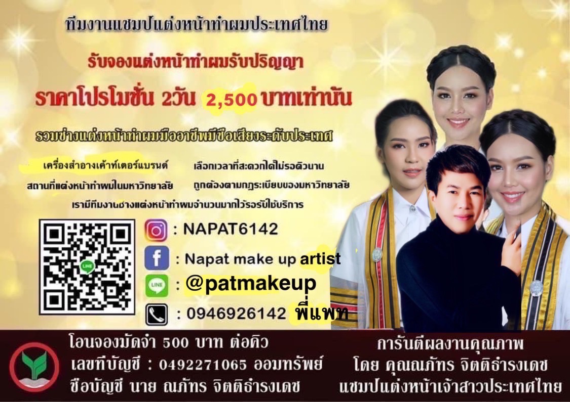 ประชาสัมพันธ์ จากฝ่ายธุรกิจพื้นที่ให้เช่า รับจองแต่งหน้าทำผม ราคาโปรโมชั่น 2 วัน 2,500 บาทเท่านั้น สำหรับบัณฑิตที่เข้ารับพระราชทานปริญญาบัตร ประจำปีพุทธศักราช 2566