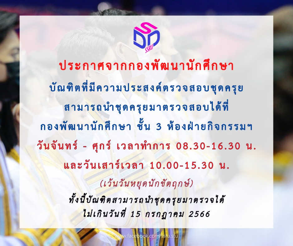 บัณฑิตที่มีความประสงค์ที่จะ ตรวจสอบชุดครุย สามารถนำชุดครุย มาตรวจสอบได้ที่ กองพัฒนานักศึกษา ชั้น 3 ห้องฝ่ายกิจกรรมฯ วันจันทร์ - ศุกร์