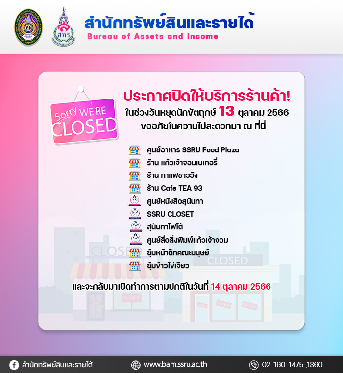 > สำนักทรัพย์สินและรายได้ ประกาศปิดให้บริการร้านค้า ในช่วงวันหยุดนักขัตฤกษ์ 13 ตุลาคม 2566