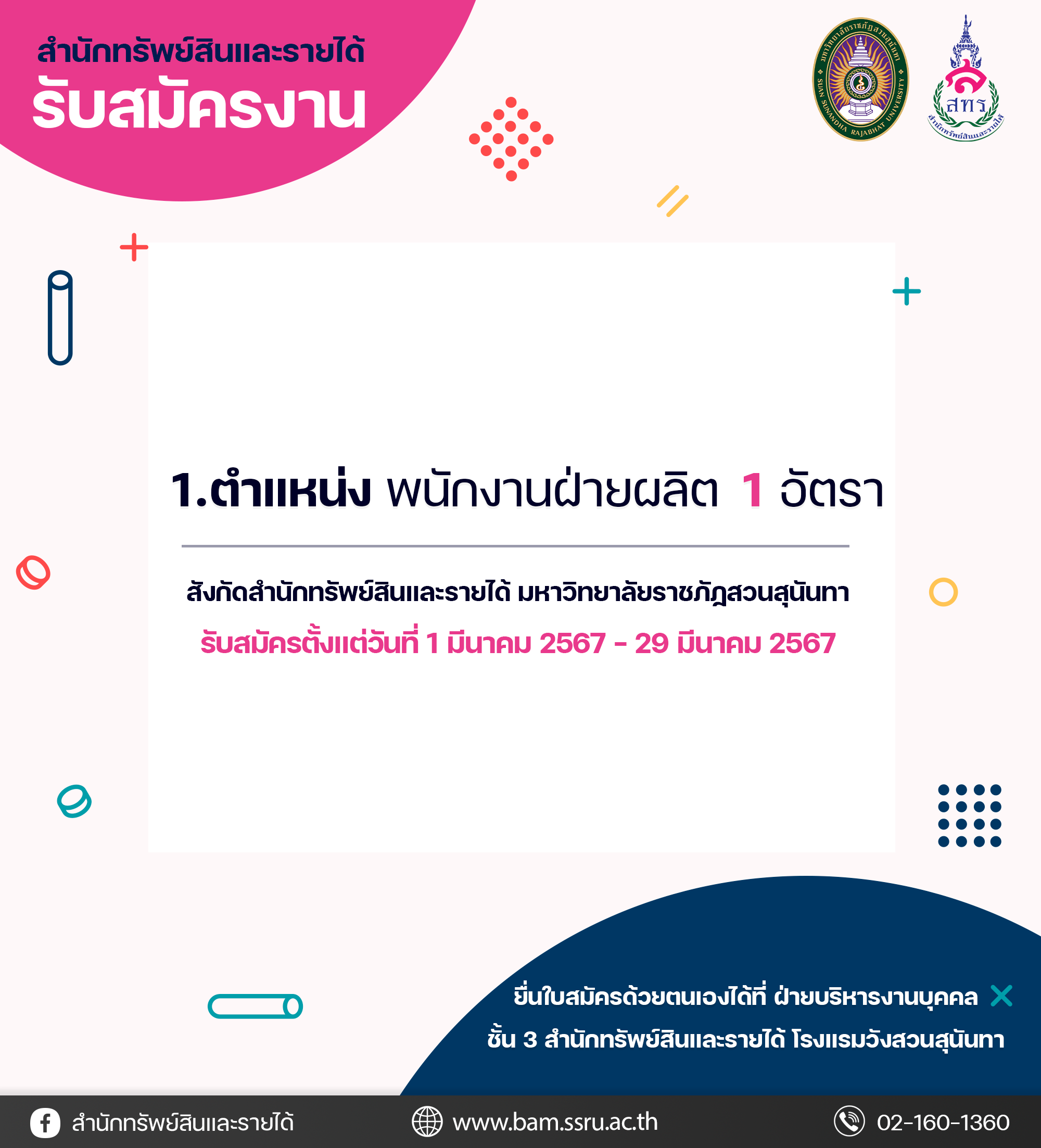 ประกาศรับสมัครงาน สำนักทรัพย์สินและรายได้ ตําแหน่ง พนักงานฝ่ายผลิต 1 อัตรา