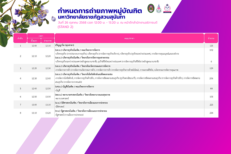 > กำหนดการถ่ายภาพหมู่บัณฑิต มหาวิทยาลัยราชภัฏสวนสุนันทา ประจำปีการศึกษา 2568