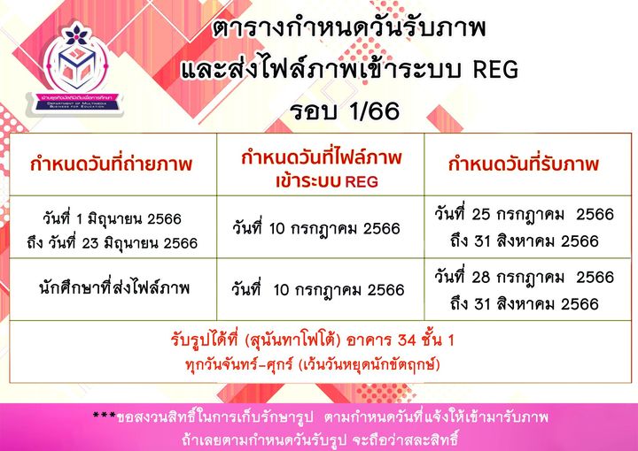 > ประกาศ กำหนดการวันรับภาพและส่งไฟล์ภาพเข้าระบบ REG เทอม 1/2566