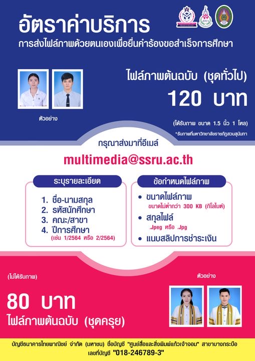 สำหรับนักศึกษาที่ต้องขอสำเร็จการศึกษา ภาคเรียนที่ 2/2564 และ 3/2564 จองถ่ายภาพไม่ทันหรือไม่สะดวกในการเดินทางมาถ่ายรูปที่มหาวิทยาลัย สามารถส่งเป็นไฟล์ภาพได้ ได้ถึงวันที่ 31 มีนาคม 2565