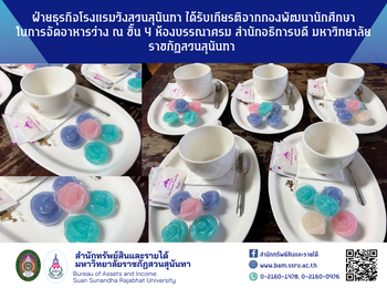 27 ตุลาคม 2564 ฝ่ายธุรกิจโรงแรมวังสวนสุนันทา ได้รับเกียรติจากกองพัฒนานักศึกษา ในการจัดอาหารว่าง ณ ชั้น 4 ห้องบรรณาศรม สำนักอธิการบดี มหาวิทยาลัยราชภัฏสวนสุนันทา
