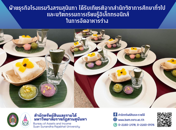 27 ตุลาคม 2564 ฝ่ายธุรกิจโรงแรมวังสวนสุนันทา ได้รับเกียรติจากสำนักวิชาการศึกษาทั่วไป และนวัตกรรมการเรียนรู้อิเล็กทรอนิกส์ในการจัดอาหารว่าง ณ ห้องประชุม 3422 ชั้น 2 อาคาร 34 มหาวิทยาลัยราชภัฏสวนสุนันทา
