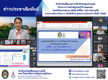 1 พฤศจิกายน 2564 เวลา 13.30 น. สำนักทรัพย์สินและรายได้ จัดประชุมถ่ายทอดโครงการวาระสำคัญประจำปี (Agenda) ประจำปีงบประมาณ 2565 ตัวชี้วัด : 2.6.1 เงินรายได้จากการบริการวิชาการ เป็นที่ปรึกษาต่ออาจารย์ประจำ ครั้งที่ 1/2565 โดยมีอาจารย์ ดร.ดวงพร แสงทอง ผู้ช่วยอธิการบดีฝ่ายกิจการพิเศษ เป็นประธานในการประชุมพร้อมด้วยผู้บริหารและบุคลากรจากหน่วยงานจัดการศึกษาและหน่วยงานสนับสนุนการศึกษาภายในมหาวิทยาลัยราชภัฏสวนสุนันทา เข้าร่วมประชุมในครั้งนี้เพื่อถ่ายทอดโครงการวาระสำคัญประจำปี (Agenda) ผ่านระบบ Google Meet