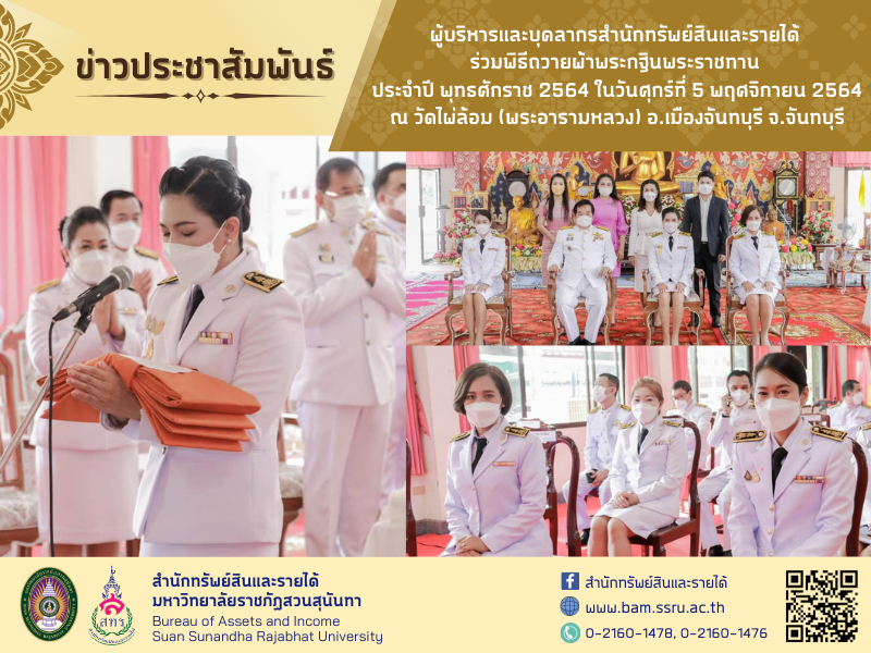 5 พฤศจิกายน 2564 พระบาทสมเด็จพระปรเมนทรรามาธิบดีศรีสินทรมหาวชิราลงกรณ พระวชิรเกล้าเจ้าอยู่หัว รัชกาลที่ 10 ทรงพระกรุณาโปรดเกล้าโปรดกระหม่อมพระราชทานผ้าพระกฐินให้กับมหาวิทยาลัยราชภัฏสวนสุนันทา เพื่อนำไปทอดถวาย ณ วัดไผ่ล้อม (พระอารามหลวง) อ.เมืองจันทบุรี จ.จันทบุรี ในวันศุกร์ที่ 5 พฤศจิกายน 2564 เวลา 10.00 น. โดยมี รองศาสตราจารย์ ดร.ชุติกาญจน์ ศรีวิบูลย์ อธิการบดี เป็นประธานในพิธี
