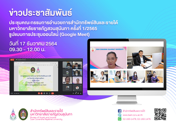 ประชุมคณะกรรมการอำนวยการสำนักทรัพย์สินและรายได้ 27 ธันวาคม 2564 เวลา 9.30 น. สำนักทรัพย์สินและรายได้ จัดประชุมคณะกรรมการอำนวยการ สำนักทรัพย์สินและรายได้ มหาวิทยาลัยราชภัฏสวนสุนันทา ครั้งที่ 1/2565 นำโดยอาจารย์ ดร.แก่นเพชร ศรานนทวัฒน์ ผู้อำนวยการ คณะผู้บริหารสำนักทรัพย์สินและรายได้ และผู้ทรงคุณวุฒิภายนอก เข้าร่วมการประชุมโดยมี รองศาสตราจารย์ ดร.ชุติกาญจน์ ศรีวิบูลย์ อธิการบดีมหาวิทยาลัยราชภัฏสวนสุนันทา เป็นประธานการประชุม รูปแบบการประชุมออนไลน์ ผ่านระบบ Google Meet