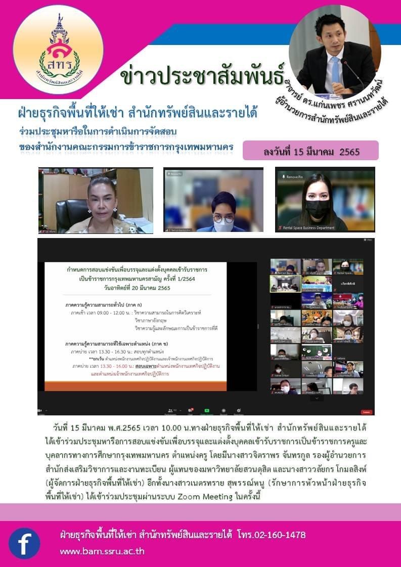 15 มีนาคม พ.ศ.2565 เวลา 10.00 น.ทางฝ่ายธุรกิจพื้นที่ให้เช่า สำนักทรัพย์สินและรายได้ ได้เข้าร่วมประชุมหารือการสอบแข่งขันเพื่อบรรจุและแต่งตั้งบุคคลเข้ารับราชการเป็นข้าราชการครูและ บุคลากรทางการศึกษากรุงเทพมหานคร ตำแหน่งครู โดยมีนางสาวจิตราพร จันทรกูล รองผู้อำนวยการสำนักส่งเสริมวิชาการและงานทะเบียน ผู้แทนของมหาวิทยาลัยสวนดุสิต และนางสาววลัยกร โกมลสิงห์ (ผู้จัดการฝ่ายธุรกิจพื้นที่ให้เช่า) อีกทั้งนางสาวเนตรทราย สุพรรณ์หนู (รักษาการหัวหน้าฝ่ายธุรกิจพื้นที่ให้เช่า) ได้เข้าร่วมประชุมผ่านระบบ Zoom Meeting ในครั้งนี้