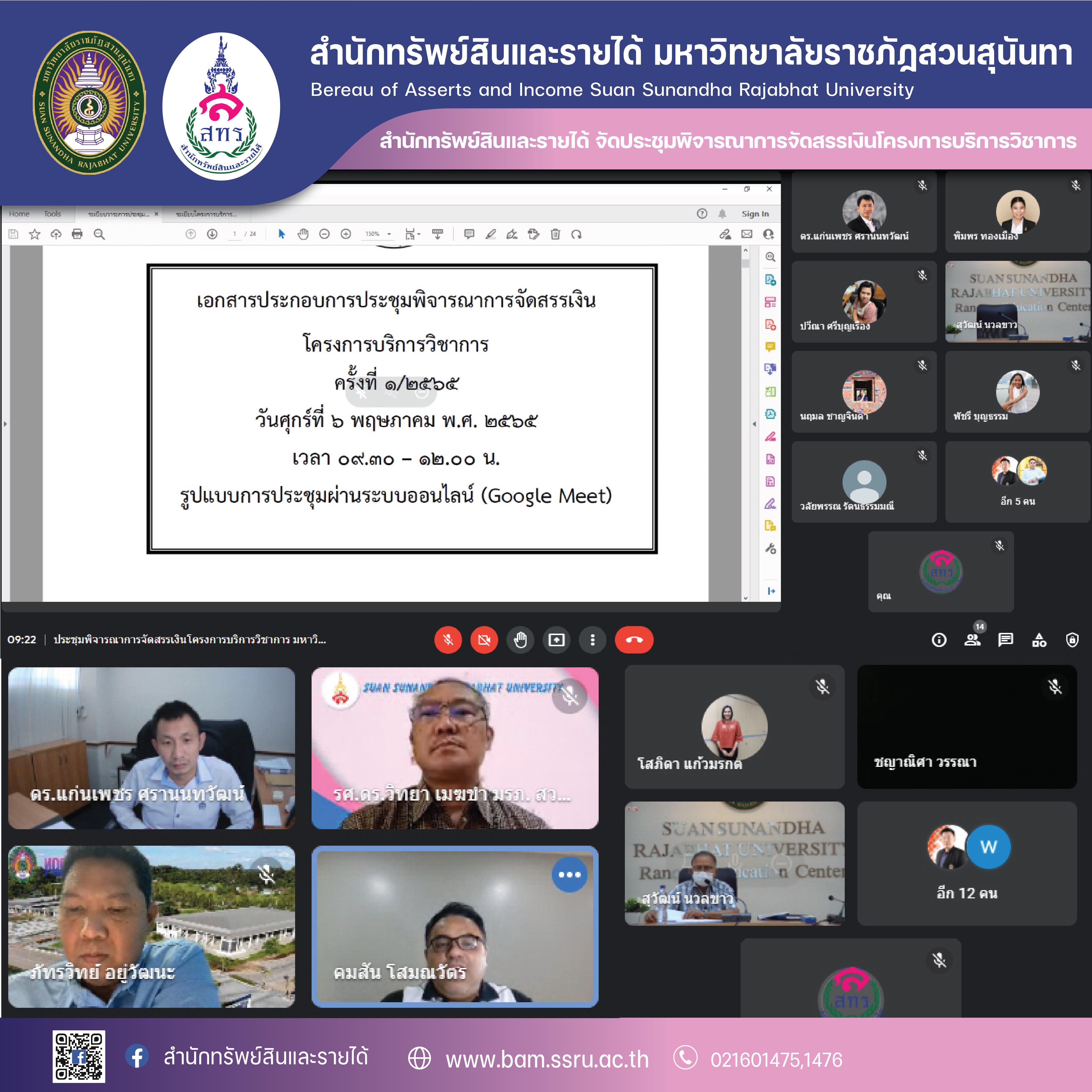 วันนี้ 6 พฤษภาคม 2565 เวลา 09.30 น. สำนักทรัพย์สินและรายได้ จัดประชุมพิจารณาการจัดสรรเงินโครงการบริการวิชาการ โดยมีรองศาสตราจารย์ ดร.วิทยา เมฆขำ รองอธิการบดีฝ่ายแผนงานและประกันคุณภาพ เป็นประธานการประชุม พร้อมด้วยคณะผู้บริหารและบุคลากรมหาวิทยาลัยราชภัฏสวนสุนันทา ในรูปแแบบการประชุมออนไลน์ ผ่านโปรแกรม Google Meet
