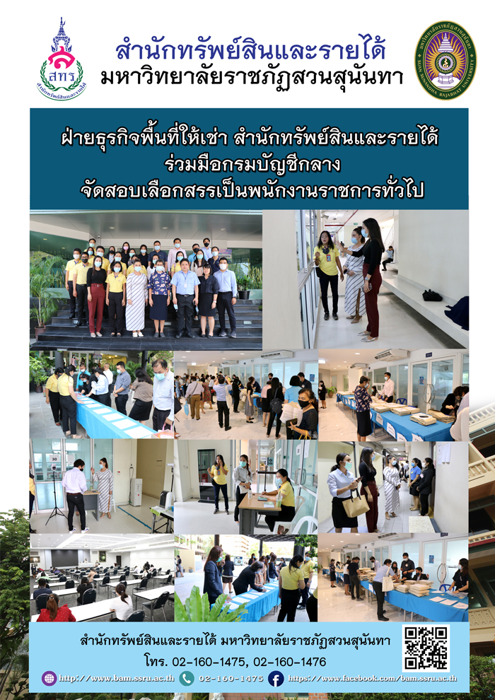 วันที่ 21 มีนาคม 2564 เวลา 07.00 - 12.00 น. ฝ่ายธุรกิจพื้นที่ให้เช่า สำนักทรัพย์สินและรายได้ ร่วมมือกรมบัญชีกลาง ดำเนินการจัดสอบเลือกสรรเป็นพนักงานราชการทั่วไป นำโดยมีนางสาววลัยกร โกมลสิงห์ รักษาการผู้จัดการฝ่ายธุรกิจพื้นที่ให้เช่า และทีมงาน ซึ่งสนามสอบมหาวิทยาลัยราชภัฏสวนสุนันทามีผู้เข้าสอบกว่า 3700 คน ใน 6 ตำแหน่ง อาทิ ตำแหน่งนิติกร นักบัญชี นักวิชาการคลัง นักจัดการงานทั่วไป เจ้าพนักงานการคลัง เจ้าหน้าที่การคลัง ณ มหาวิทยาลัยราชภัฏสวนสุนันทา