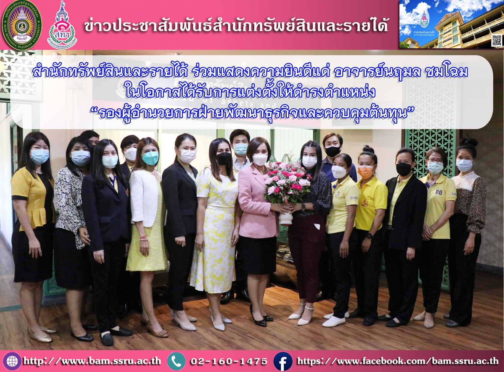 สำนักทรัพย์สินและรายได้ ร่วมแสดงความยินดีแด่ อาจารย์นฤมล ชมโฉม ในโอกาสได้รับการแต่งตั้งให้ดำรงตำแหน่ง “รองผู้อำนวยการฝ่ายพัฒนาธุรกิจและควบคุมต้นทุน”