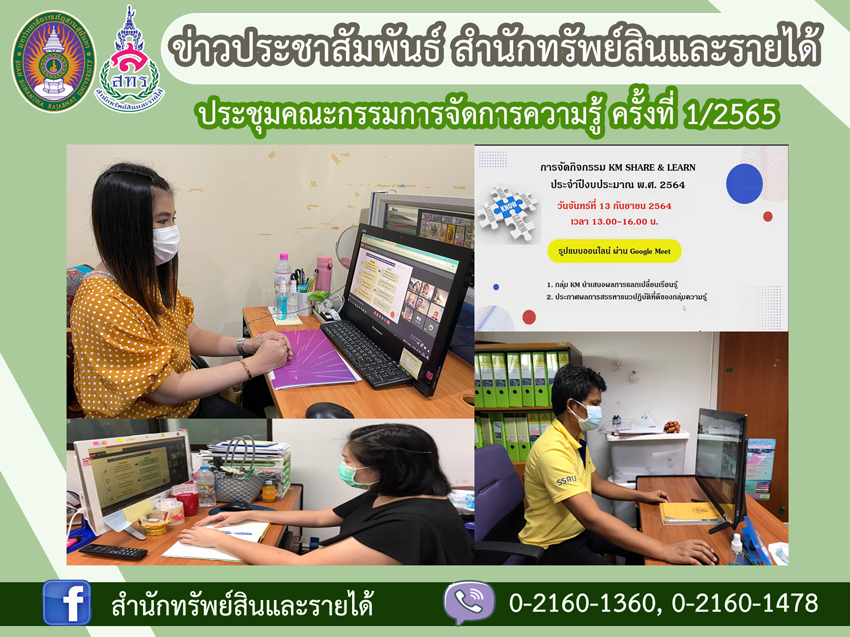 16 สิงหาคม 2564 เวลา 09.00 น. นางสาวจีรนันท์ เวือมประโคน หัวหน้าสำนักงานสำนักทรัพย์สินและรายได้ พร้อมด้วยเจ้าหน้าที่ฝ่ายแผน เข้าร่วมการประชุมคณะกรรมการจัดการความรู้ ครั้งที่ 1/2565 ผ่านระบบการประชุมออนไลน์ google meet