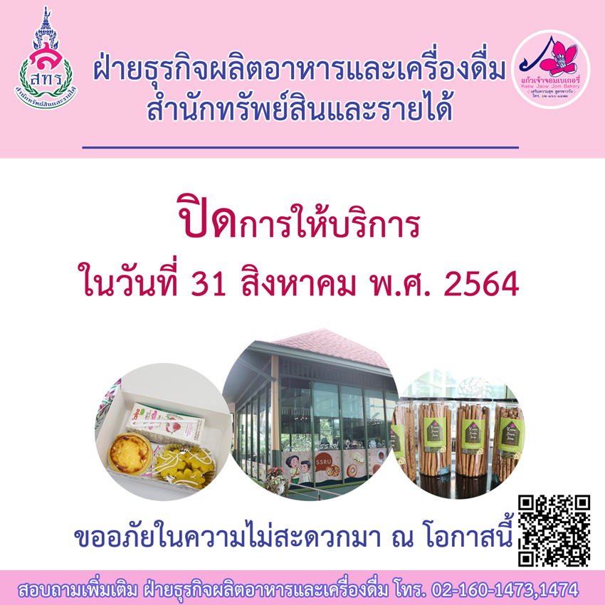 ขอแจ้งการปิดให้บริการ ในวันอังคารที่ 31 สิงหาคม 2564 เป็นเวลา 1 วัน ขออภัยในความไม่สะดวกมา ณ โอกาสนี้