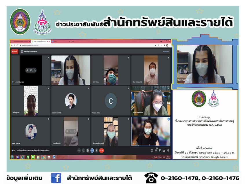 10 กันยายน พ.ศ. 2564 เวลา 14.00 น. ผู้บริหารและบุคลากรสำนักทรัพย์สินและรายได้ ประชุมชี้แจงแนวทางการดำเนินการจัดทำแผนการจัดการความรู้ ประจำปีงบประมาณ 2565 ในรูปแบบการประชุมออนไลน์ ผ่านระบบ google meet โดยมี นางสาว จีรนันท์ เวือมประโคน หัวหน้าสำนักงาน สำนักทรัพย์สินและรายได้ เป็นประธานในการประชุม