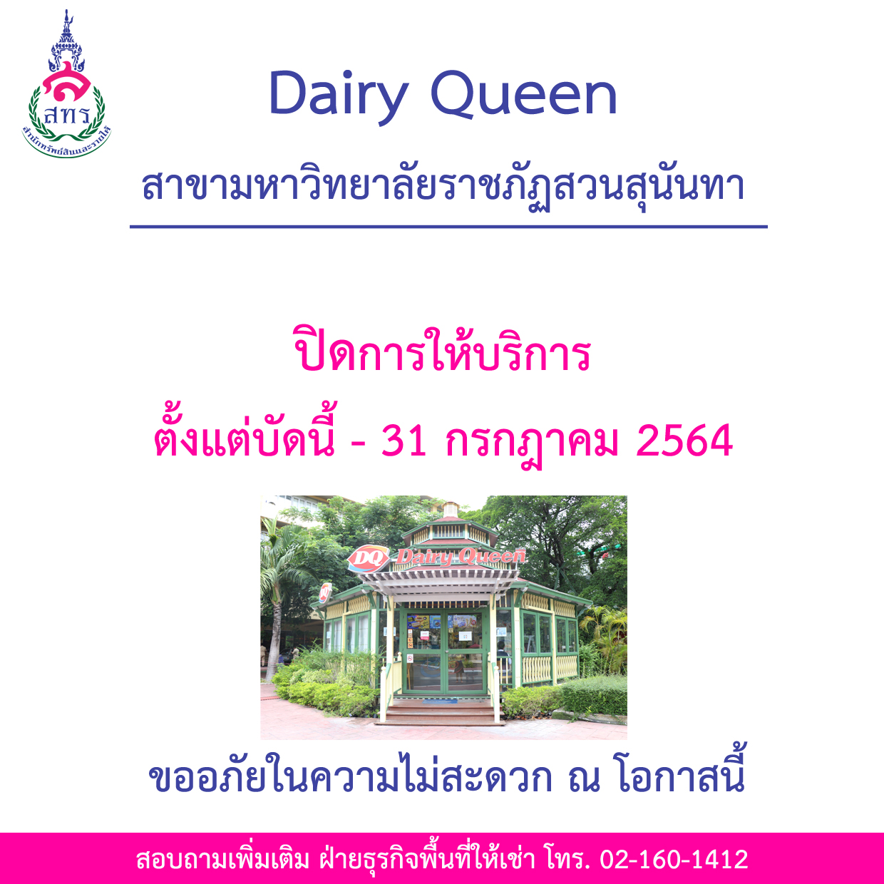 ร้าน Dairy Queen สาขามหาวิทยาลัยราชภัฏสวนสุนันทา ปิดการให้บริการ