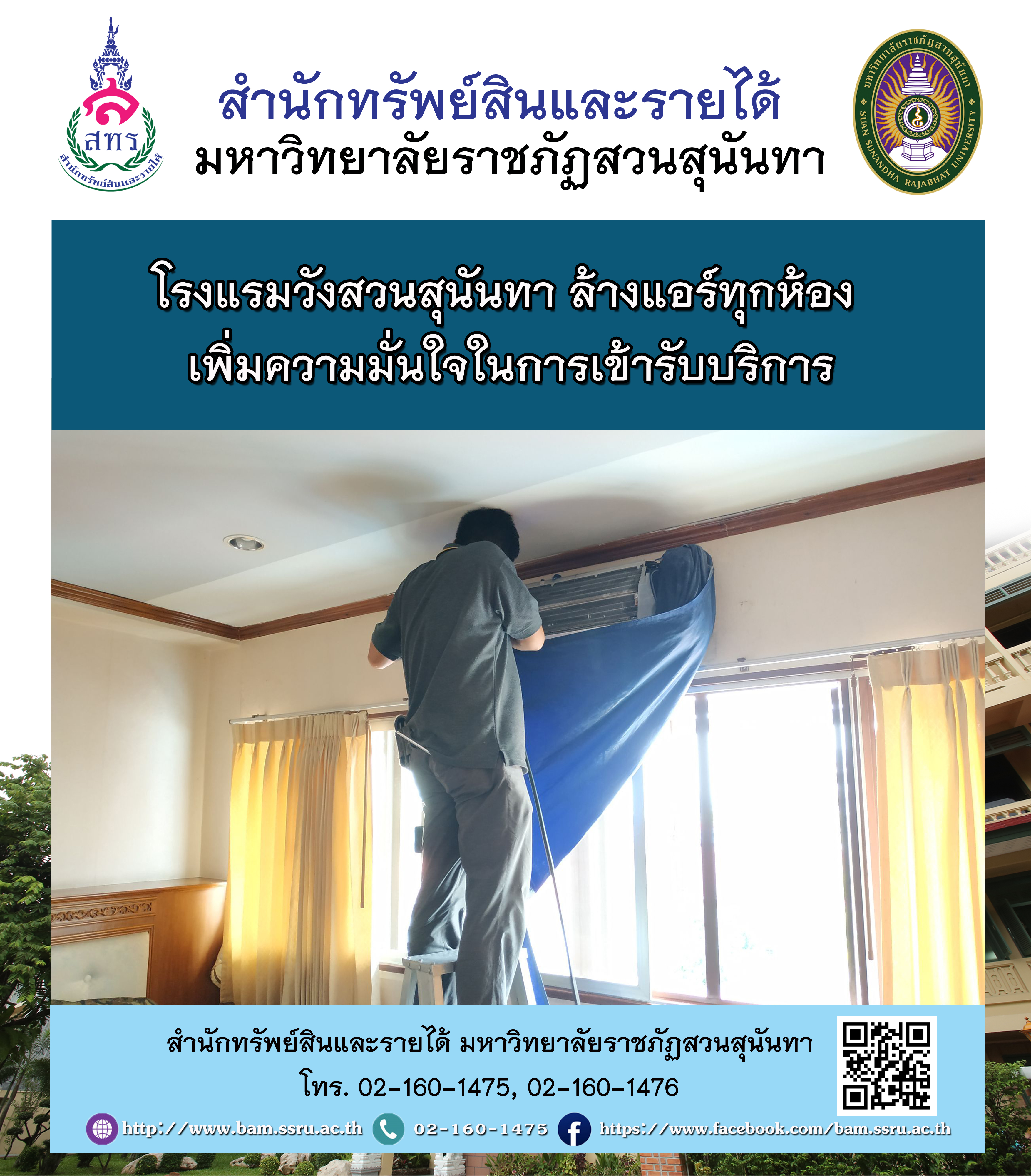 ด้วยสถานการณ์การแพร่ระบาดโควิด-19 เพื่อความปลอดภัยของผู้ใช้บริการ ทางโรงแรมวังสวนสุนันทา สำนักทรัพย์สินและรายได้ มีการล้างแอร์ทุกห้อง เพื่อให้ผู้ใช้บริการมั่นใจในการเข้ารับบริการจากโรงแรมวังสวนสุนันทา
